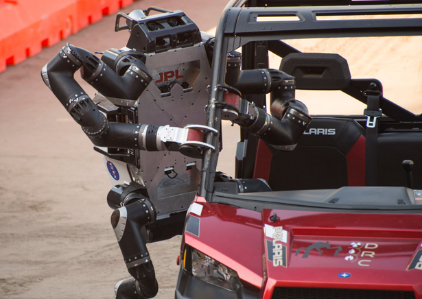 Spider-monkey! Robosimian is designed to navigate in extreme environments necessitating challenging manipulation tasks. Its unique arms and leg (28 joint system) allows for creative approaches to navigation and handling problems.